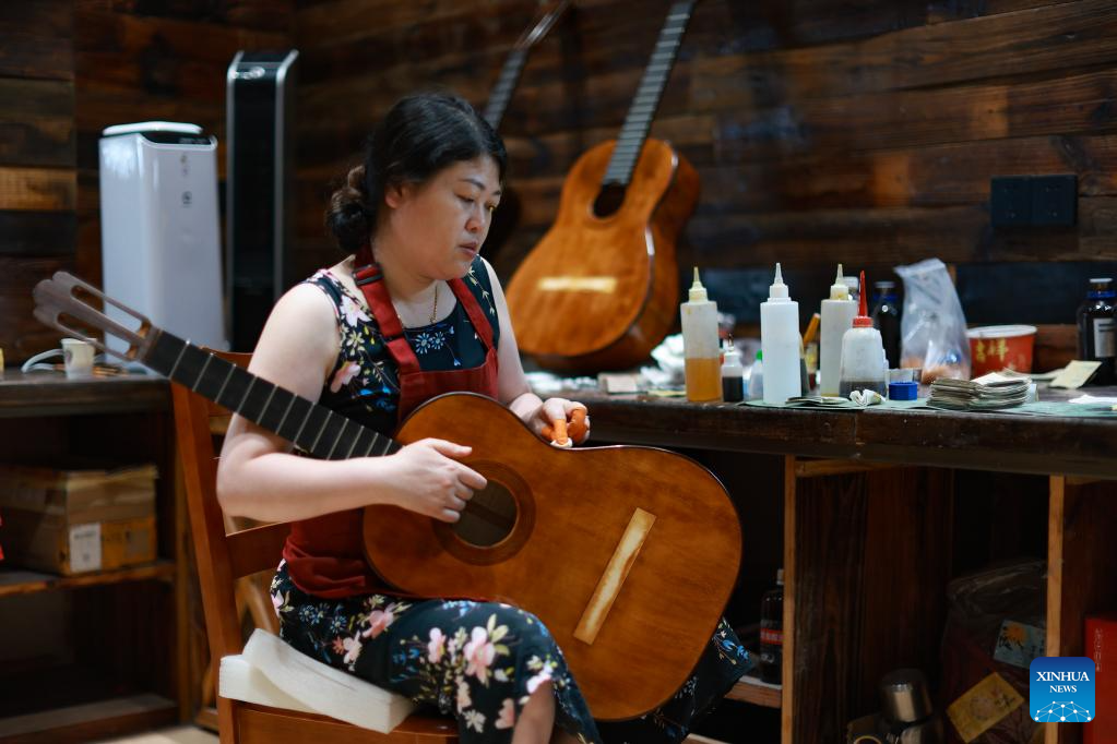 A worker tunes a guitar at the Zheng'an Guitar Industrial Park in Zheng'an County, southwest China's Guizhou Province, June 7, 2023.