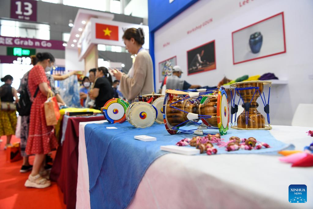 Visitors buy products at a booth from Mali during the 19th China (Shenzhen) International Cultural Industries Fair in Shenzhen, south China's Guangdong Province, June 9, 2023. The 19th China (Shenzhen) International Cultural Industries Fair kicked off here on Wednesday, which is expected to inject new impetus into the development of the country's cultural industry. Over 300 exhibitors from more than 50 countries and regions have registered to display their distinctive products in the fair's Belt and Road International Exhibition Area. (Xinhua/Liang Xu)