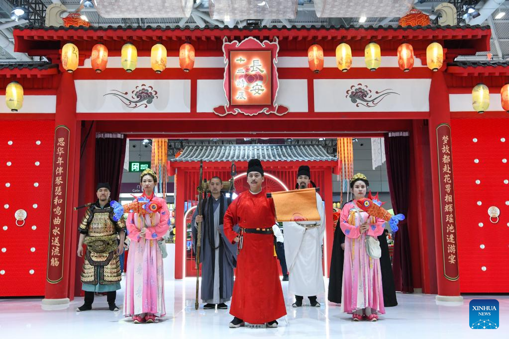 Staff members in ancient costumes at China's Shaanxi booth welcome visitors during the 19th China (Shenzhen) International Cultural Industries Fair in Shenzhen, south China's Guangdong Province, June 9, 2023. The 19th China (Shenzhen) International Cultural Industries Fair kicked off here on Wednesday, which is expected to inject new impetus into the development of the country's cultural industry. Over 300 exhibitors from more than 50 countries and regions have registered to display their distinctive products in the fair's Belt and Road International Exhibition Area. (Xinhua/Liang Xu)
