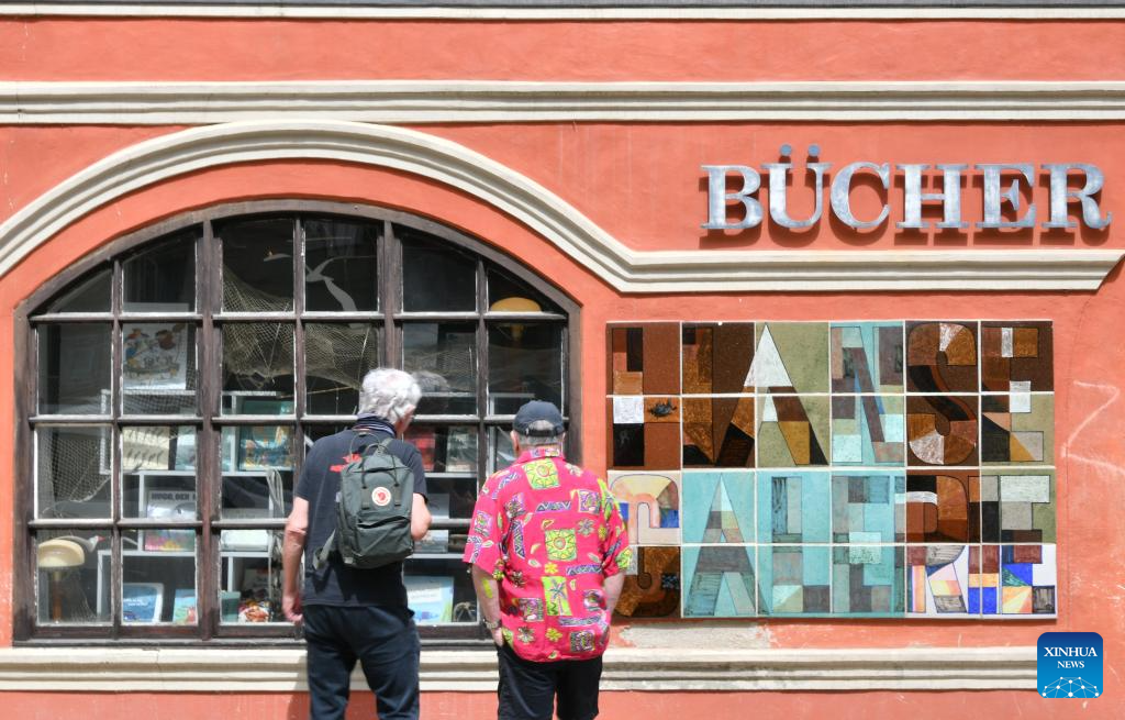 Two men stand in front of a window of a book store in Stralsund, northeastern Germany, June 1, 2023. (Xinhua/Ren Pengfei)