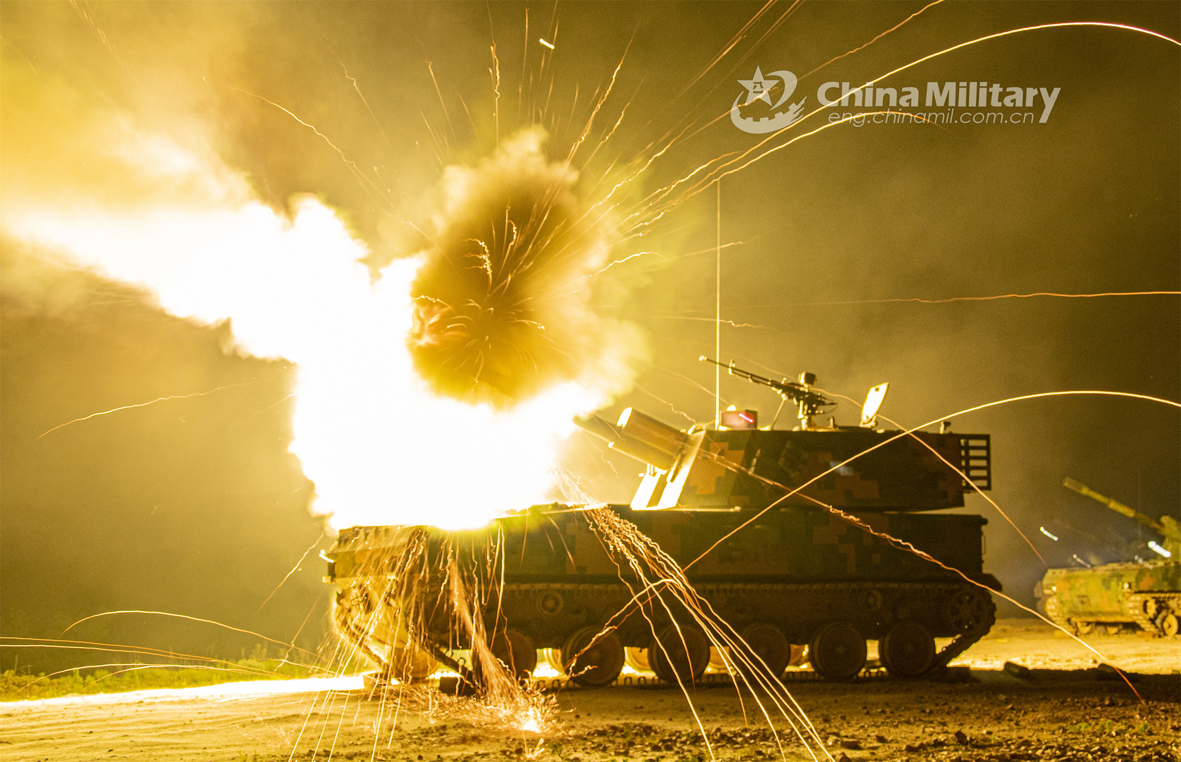 Main battle tanks attached to an artillery element of a brigade under the PLA 71st Group Army fire at simulated targets at night during a round-the-clock live-fire exercise in late May, 2023. (eng.chinamil.com.cn/Photo by Wan Zhiqi)