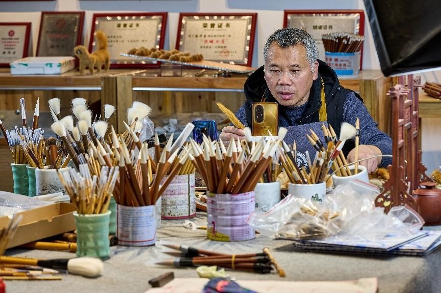An inheritor of intangible cultural heritage ink brush making livestreams in Wengang township, Nanchang, east China's Jiangxi province. (People's Daily Online/Shi Jiamin)