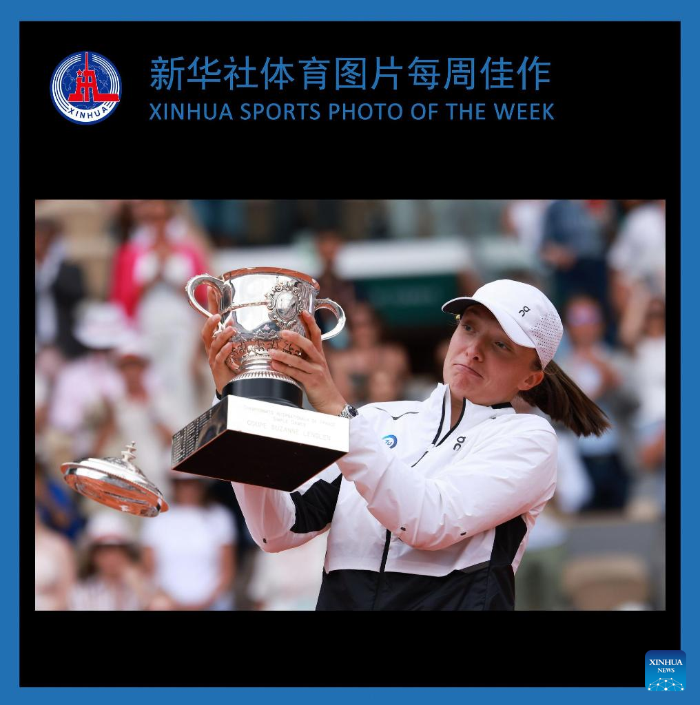 Iga Swiatek looks at the falling top of Suzanne Lenglen trophy during the trophy ceremony for the women's singles final match between Iga Swiatek of Poland and Karolina Muchova of the Czech Republic at the French Open tennis tournament at Roland Garros in Paris, France, June 10, 2023. (Xinhua/Gao Jing)
