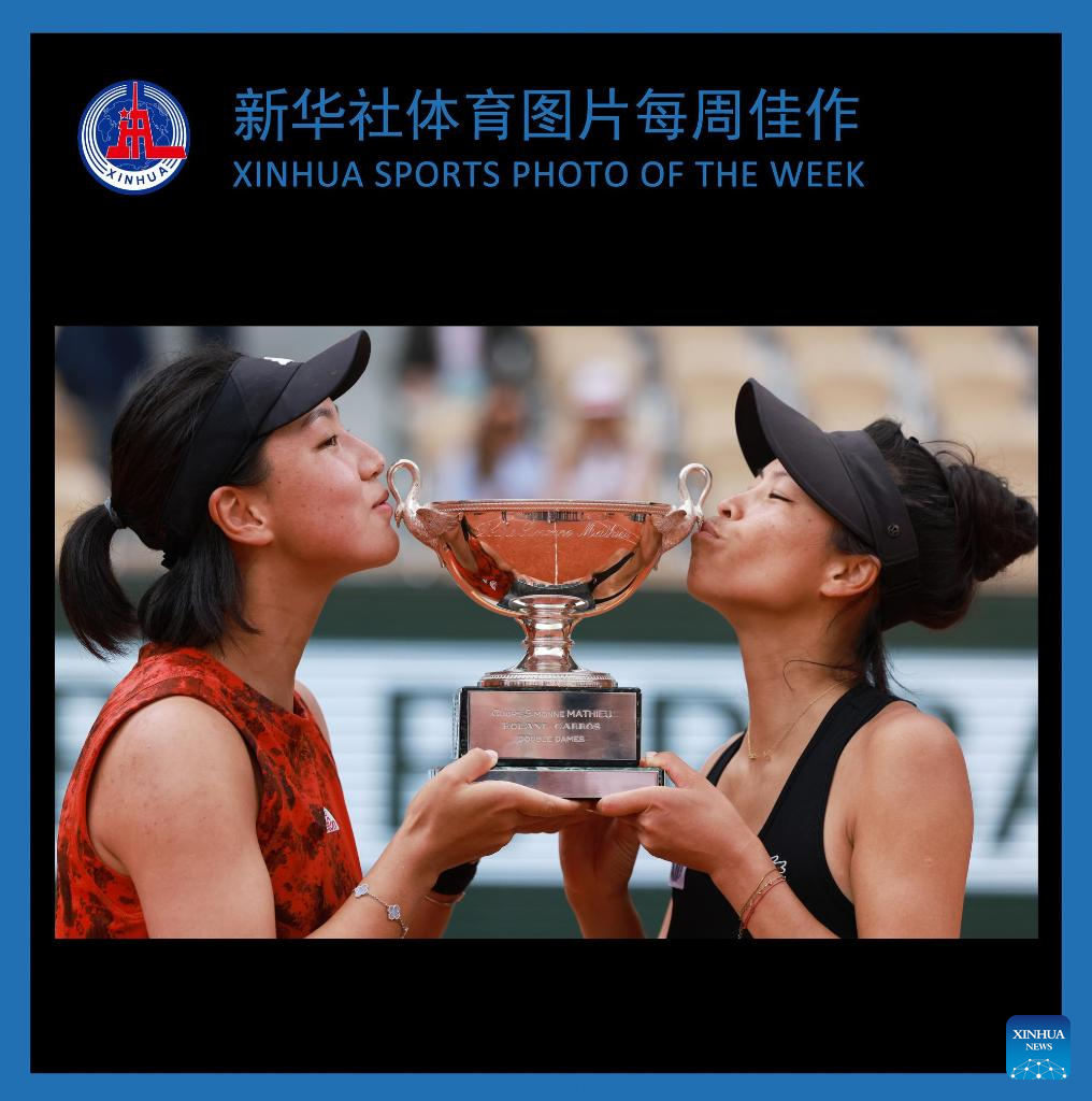 Wang Xinyu (L) of China/Hsieh Su-Wei of Chinese Taipei kiss the Simonne Mathieu Cup after winning the women's doubles final against Leylah Fernandez of Canada/Taylor Townsend of the United States at the French Open tennis tournament at Roland Garros in Paris, France, June 11, 2023. (Xinhua/Gao Jing)