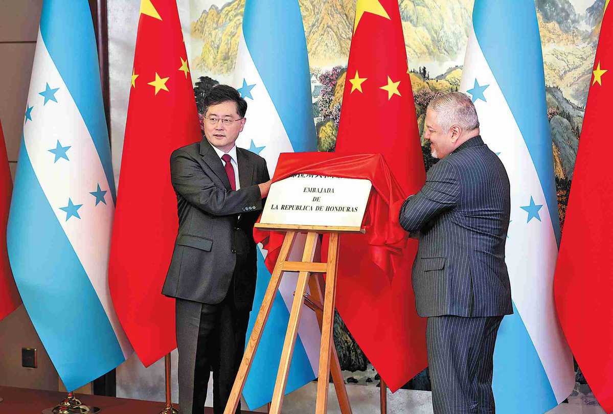 State Councilor and Foreign Minister Qin Gang and Honduran Foreign Minister Enrique Reina jointly unveiled a plaque to formally inaugurate the Central American country's embassy in Beijing on Sunday morning.