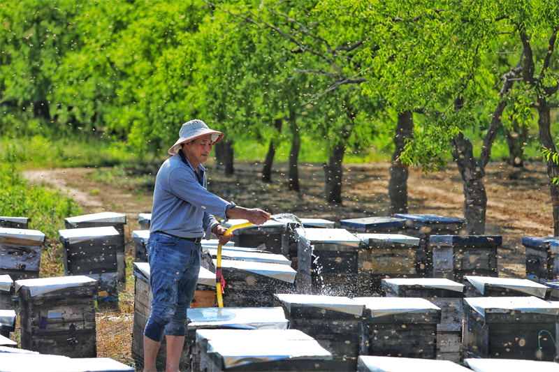 A beekeeper sprays water on beehives at a jujube orchard in Zhuji township, Laoling, east China's Shandong Province. (Photo/Jia Peng)