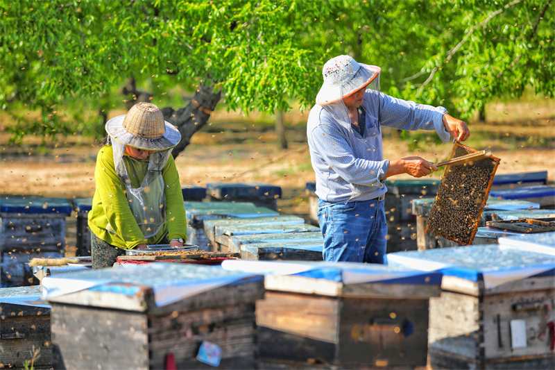 Beekeepers gather honey at a jujube orchard in Zhuji township, Laoling, east China's Shandong Province. (Photo/Jia Peng)