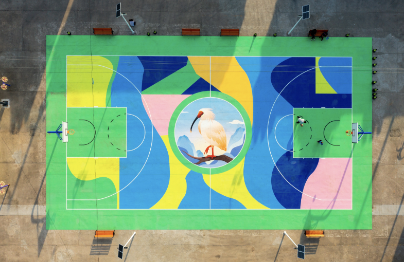A photo shows a basketball court featuring the image of a crested ibis in Liulin village, Miaowan township, Tongchuan city, northwest China's Shaanxi Province. (Photo courtesy of the interviewee)
