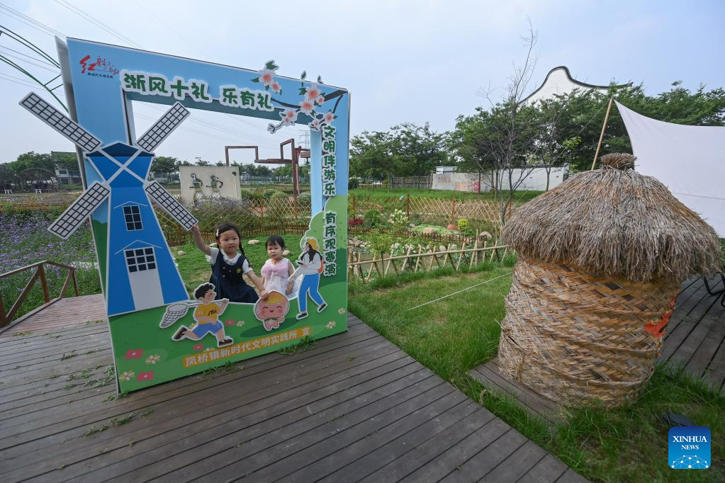 Kids pose for a photo in Lianfeng Village of Nanhu District, Jiaxing City, east China's Zhejiang Province, June 14, 2023.