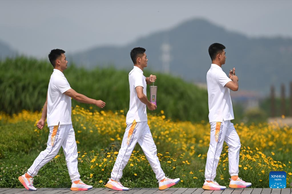 Flame guards leave with the flame lantern after the Hangzhou 2022 Asian Games Flame Lighting Ceremony at the Archaeological Ruins of Liangzhu City park in Hangzhou, east China's Zhejiang Province, on June 15, 2023. (Xinhua/Huang Zongzhi)