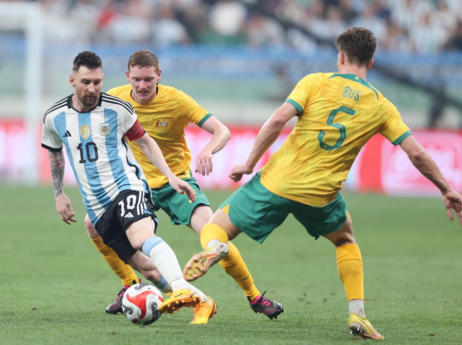 Lionel Messi (L) of Argentina in action during an international friendly between Argentina and Australia in Beijing, on June 15, 2023. (Xinhua/Jia Haocheng)