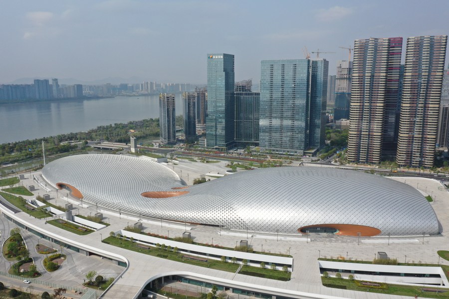 Areial photo taken on March 30, 2022 shows a view of the Hangzhou Olympic Sports Center Gymnasium and Hangzhou Olympic Sports Center Aquatic Sports Arena, venues of the Hangzhou 2022 Asian Games. (Xinhua/Huang Zongzhi)