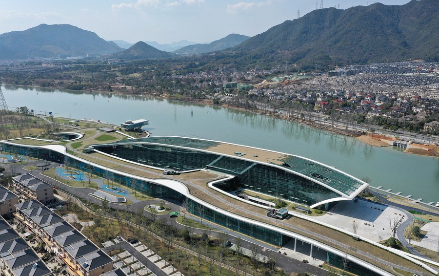 Areial photo taken on March 11, 2022 shows a view of the Fuyang Water Sports Center, a venue of the Hangzhou 2022 Asian Games. (Xinhua/Xu Yu)