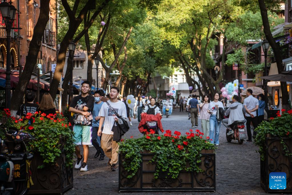 Tourists walk on Jianghan Road, a signature pedestrian street of Hankou historical area, in Wuhan, central China's Hubei Province, June 15, 2023. Covering an area of 6.02 square kilometers, the Hankou historical area in the heart of Wuhan City's old town, boasts an abundance of historical and cultural heritages.
