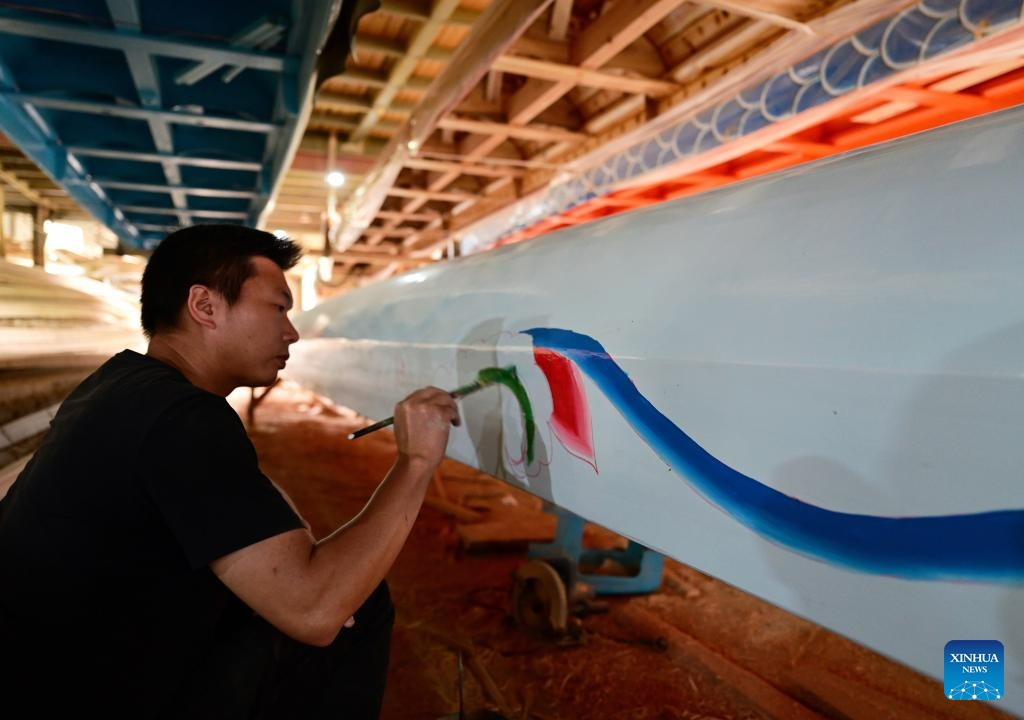 A craftsman paints a dragon boat in Fangzhuang Village, Minhou County, Fuzhou City, southeast China's Fujian Province, May 23, 2023.