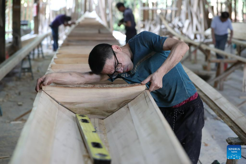 Craftsmen make a dragon boat in Fangzhuang Village, Minhou County, Fuzhou City, southeast China's Fujian Province, June 12, 2023.