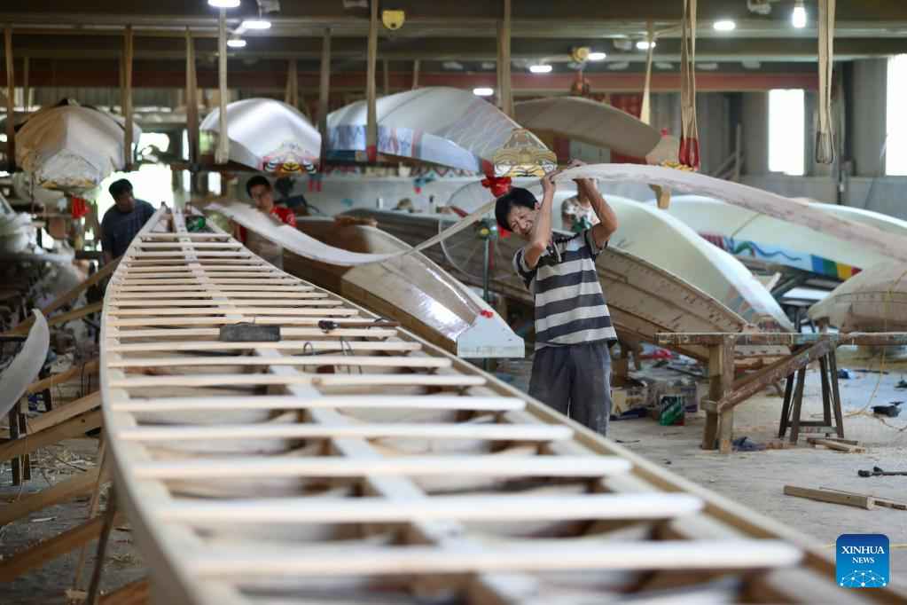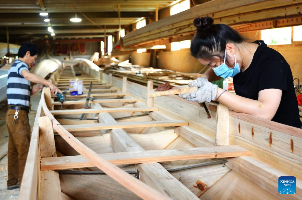 Craftsmen make a dragon boat in Fangzhuang Village, Minhou County, Fuzhou City, southeast China's Fujian Province, May 23, 2023.