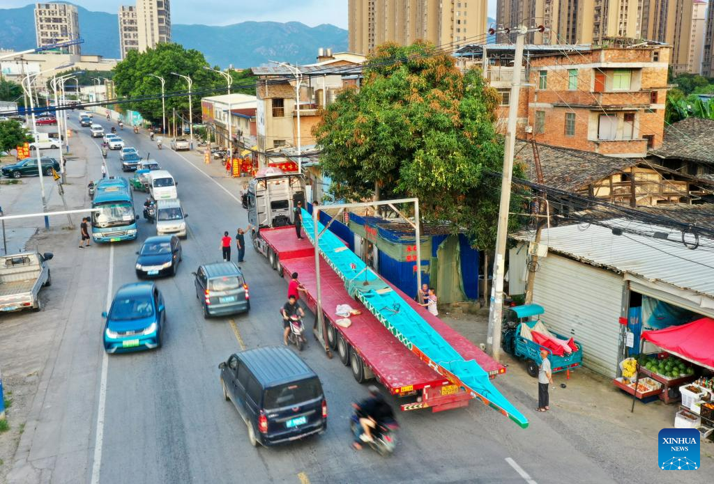 This aerial photo taken on June 12, 2023 shows a dragon boat being loaded onto a truck in Minhou County, Fuzhou City, southeast China's Fujian Province.