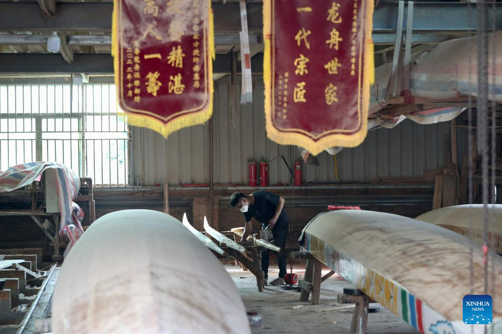 A craftsman makes dragon boats in Fangzhuang Village, Minhou County, Fuzhou City, southeast China's Fujian Province, June 12, 2023.