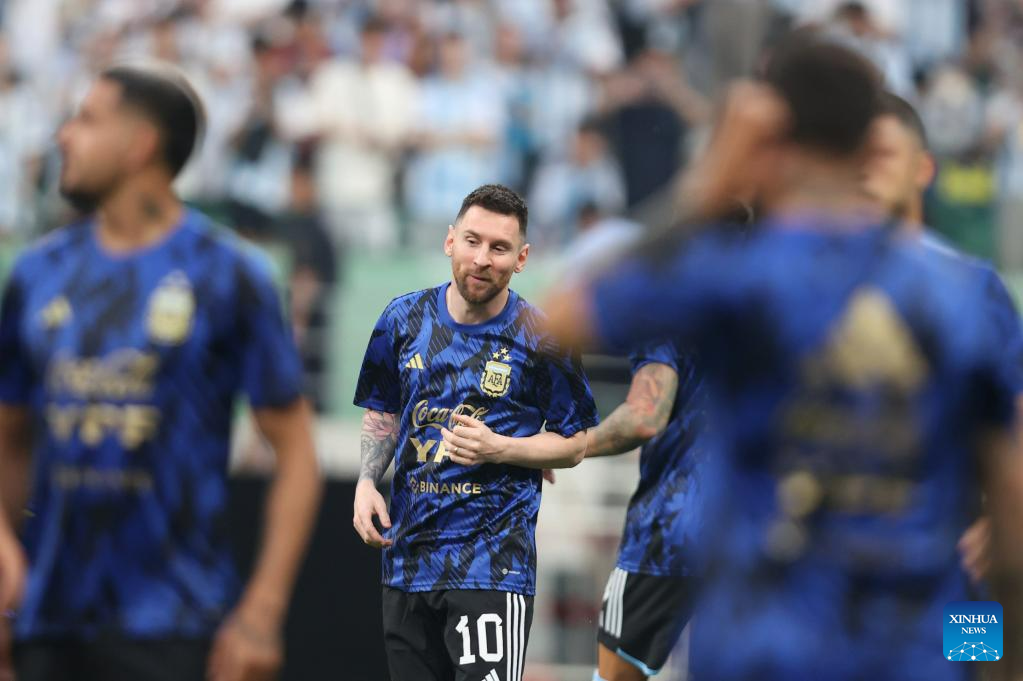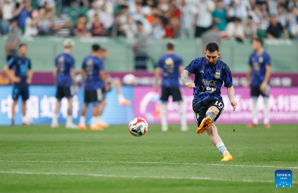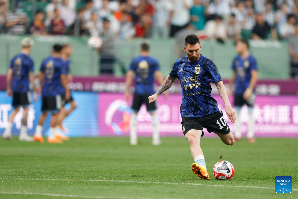 Lionel Messi of Argentina warms up ahead of an international football invitational between Argentina and Australia in Beijing, capital of China, June 15, 2023. (Xinhua/Wang Lili)