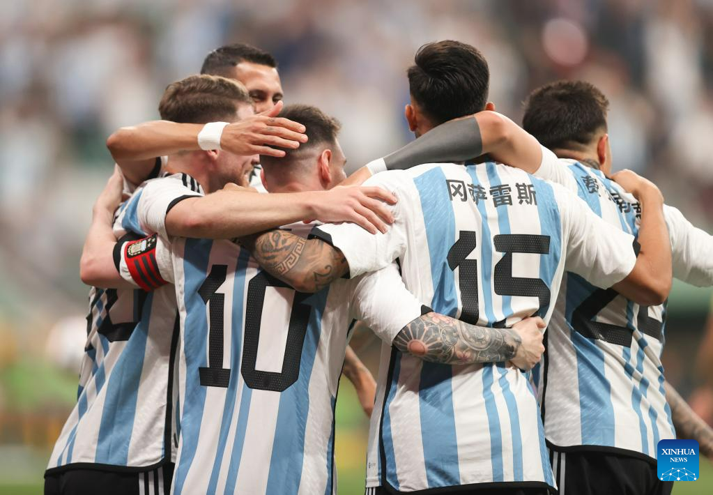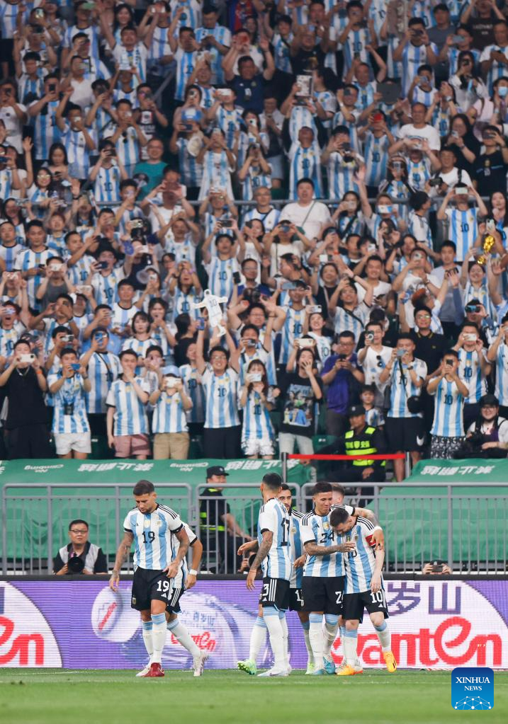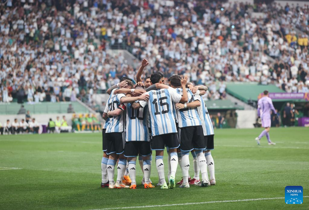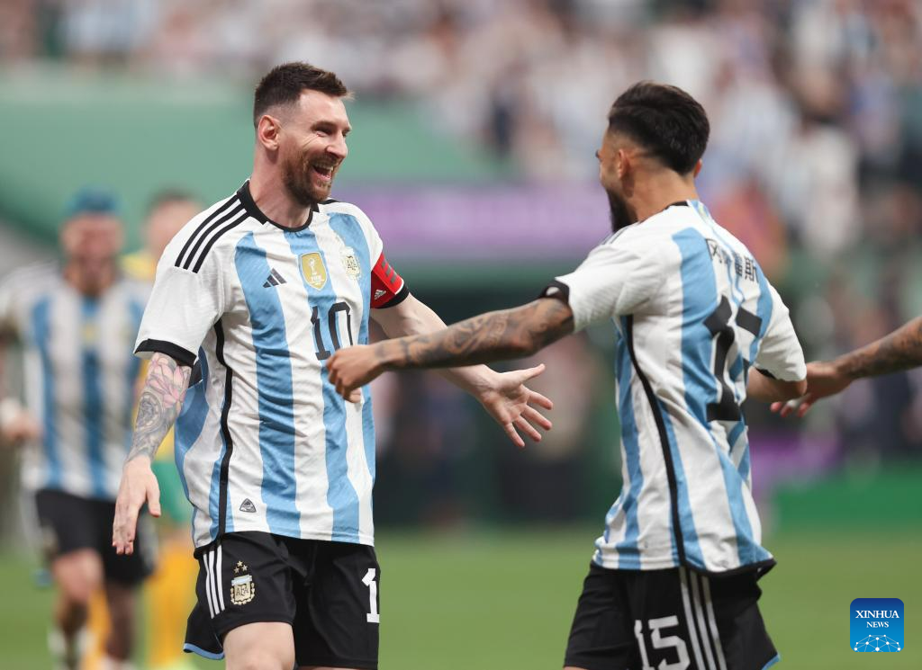 Players of Argentina celebrate the goal of Lionel Messi during an international football invitational between Argentina and Australia in Beijing, capital of China, June 15, 2023. (Xinhua/Jia Haocheng)
