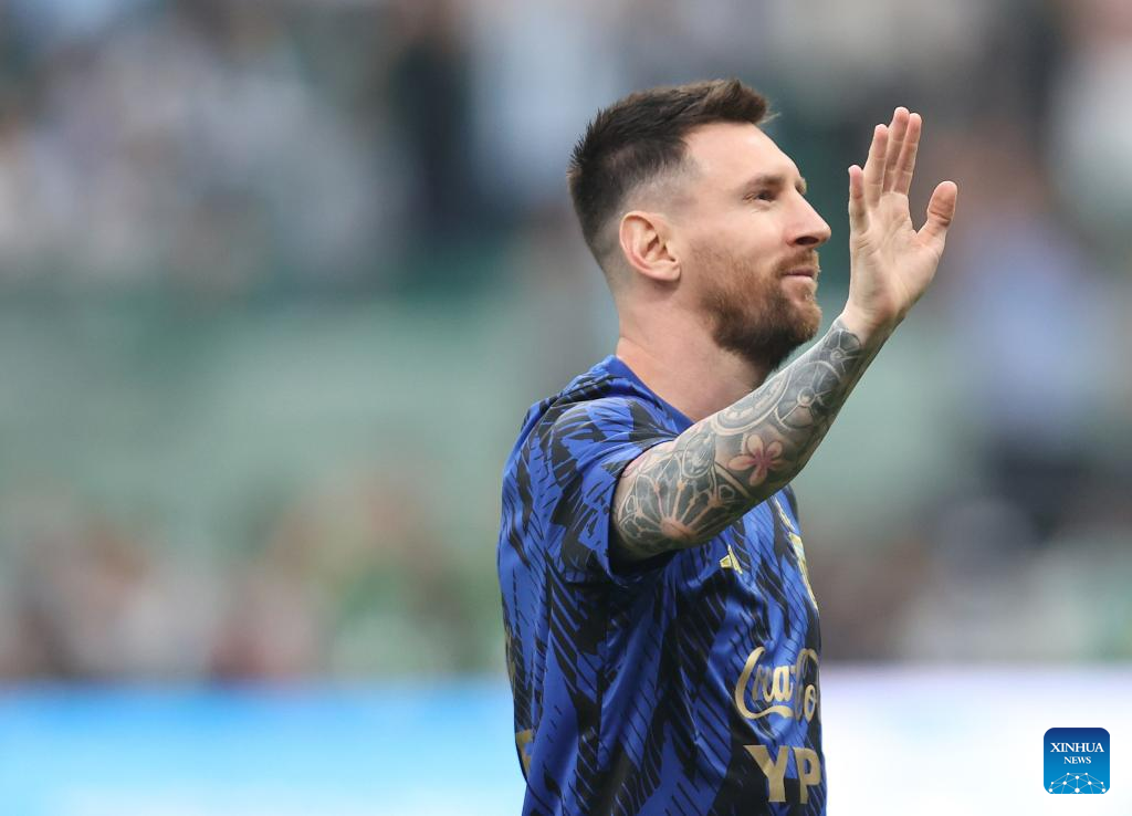 Lionel Messi of Argentina greets spectators ahead of an international football invitational between Argentina and Australia in Beijing, capital of China, June 15, 2023. (Xinhua/Jia Haocheng)