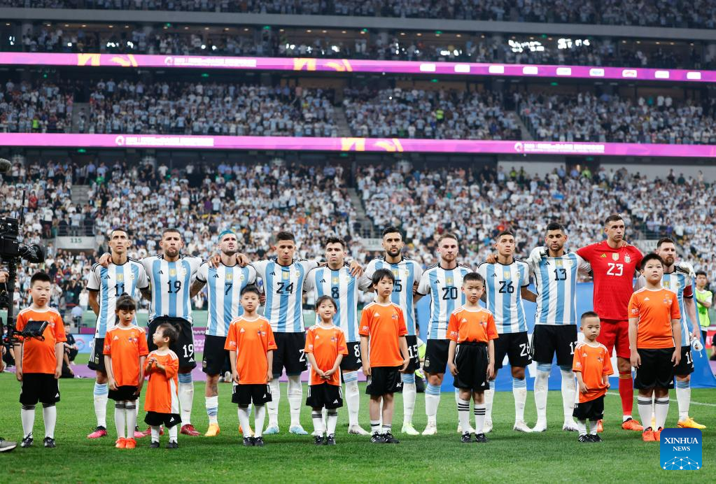 Players of Argentina line up ahead of an international football invitational between Argentina and Australia in Beijing, capital of China, June 15, 2023. (Xinhua/Wang Lili)