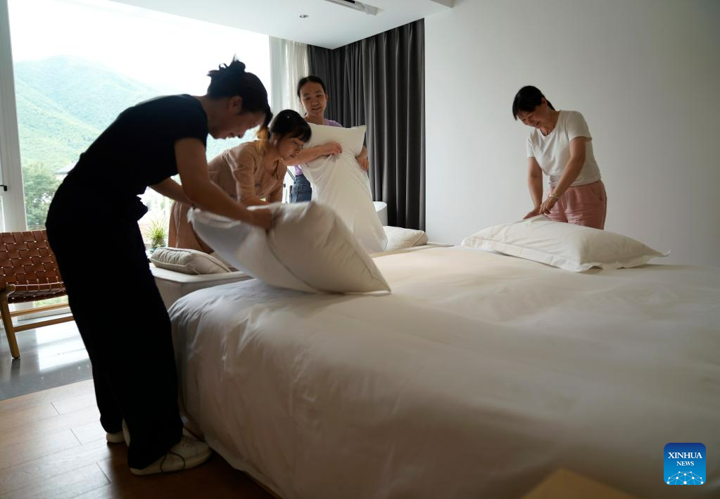 Operators of homestay take part in a housekeeping training at a homestay in Xiantan Village, Moganshan Town, Deqing County, east China's Zhejiang Province, June 15, 2023. Deqing County on Thursday offered a training program to the owners and operators of local homestays to further improve services. The county has witnessed an ongoing growth of premium homestays, most notably in Moganshan Town. In 2022, homestay operator was added to China's list of new occupations by the Ministry of Human Resources and Social Security. (Xinhua/Han Chuanhao)