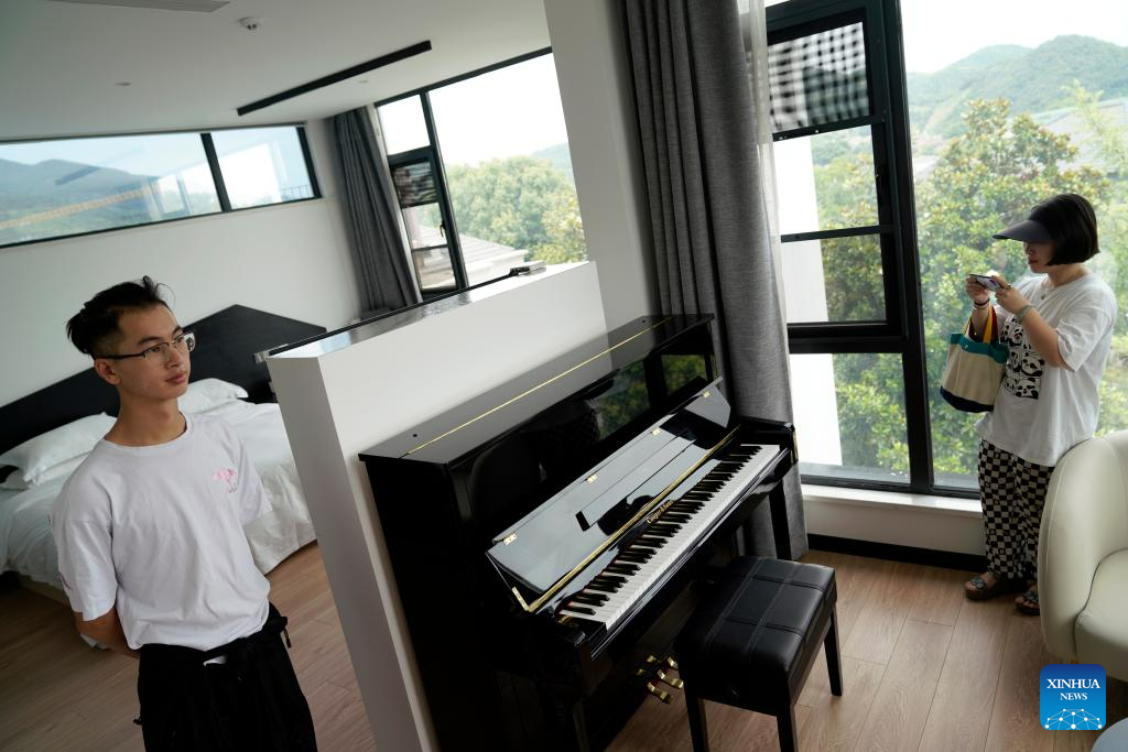 Owners and operators of homestay visit a music-themed homestay in Liaoyuan Village, Moganshan Town, Deqing County, east China's Zhejiang Province, June 15, 2023. Deqing County on Thursday offered a training program to the owners and operators of local homestays to further improve services. The county has witnessed an ongoing growth of premium homestays, most notably in Moganshan Town. In 2022, homestay operator was added to China's list of new occupations by the Ministry of Human Resources and Social Security. (Xinhua/Han Chuanhao)