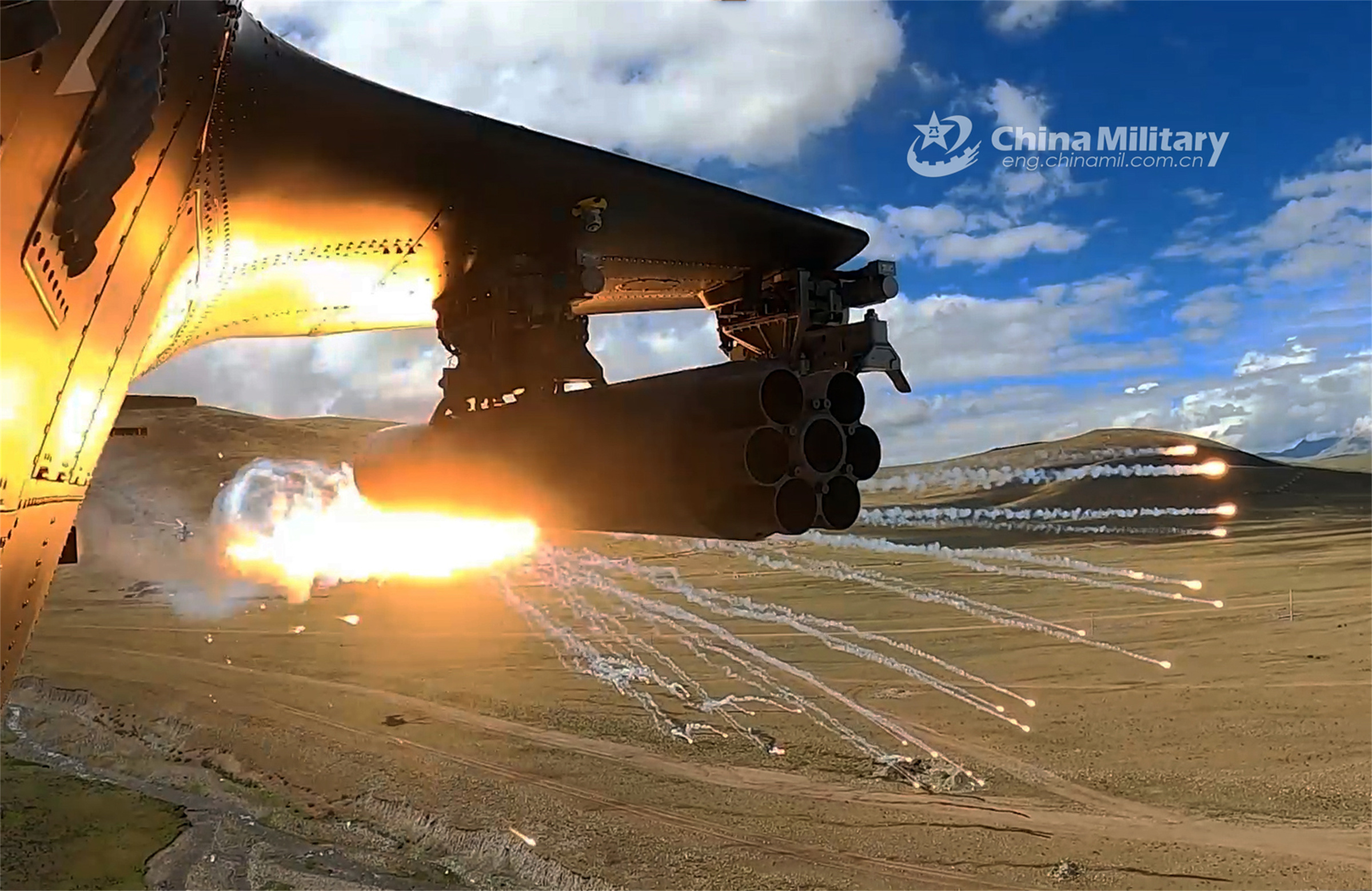 Attack helicopters attached to a brigade under the PLA Xizang Military Command fire rockets at mock targets during a recent live-fire training exercise. (eng.chinamil.com.cn/Photo by Hu Qiwu)