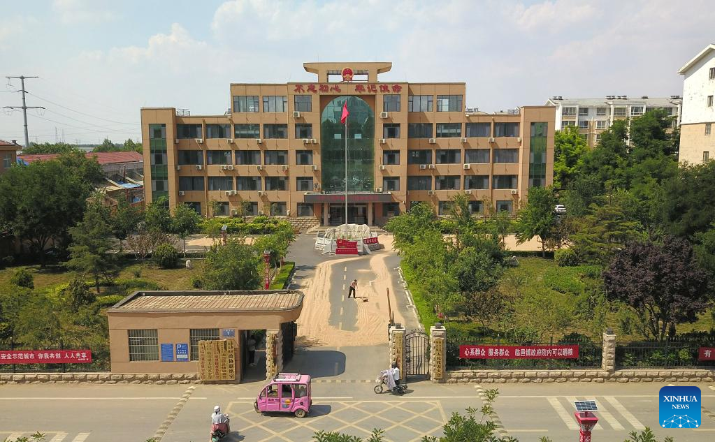 This aerial photo shows farmers drying grain at the government compound of Linyi Town in Linyi County, east China's Shandong Province, June 13, 2023. As the latest round of heatwaves coincides with the summer harvest season, many cities in Shandong have opened government compounds and village entertainment venues and squares for farmers to dry their grain. (Xinhua/Xu Suhui)