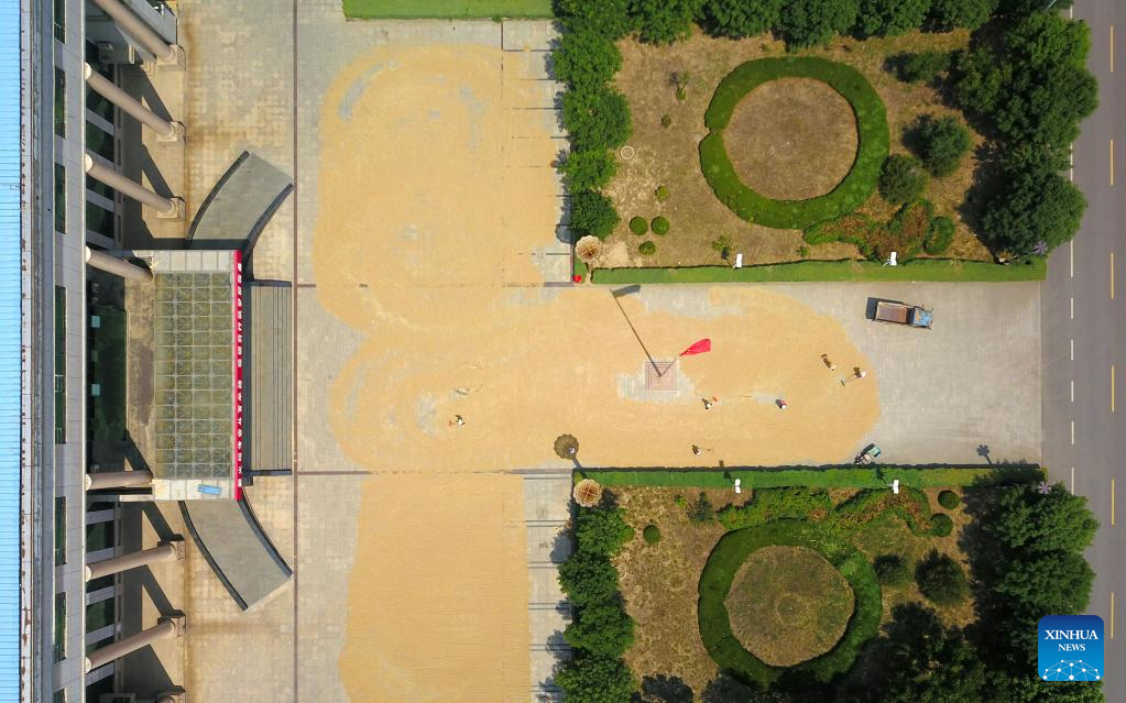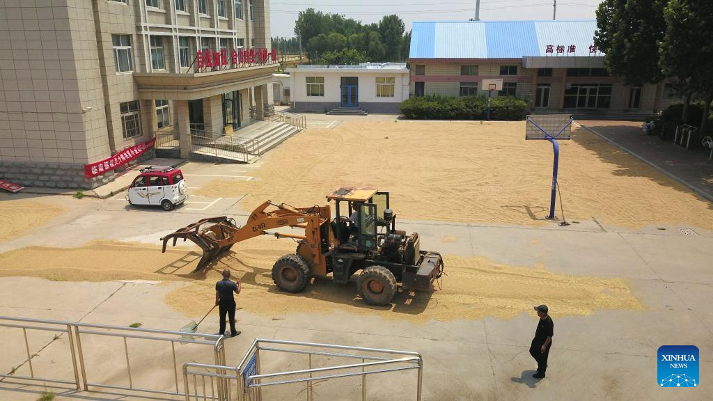 This aerial photo shows farmers drying grain at the government compound of Linpan subdistrict in Linyi County, east China's Shandong Province, June 13, 2023. As the latest round of heatwaves coincides with the summer harvest season, many cities in Shandong have opened government compounds and village entertainment venues and squares for farmers to dry their grain. (Xinhua/Xu Suhui)