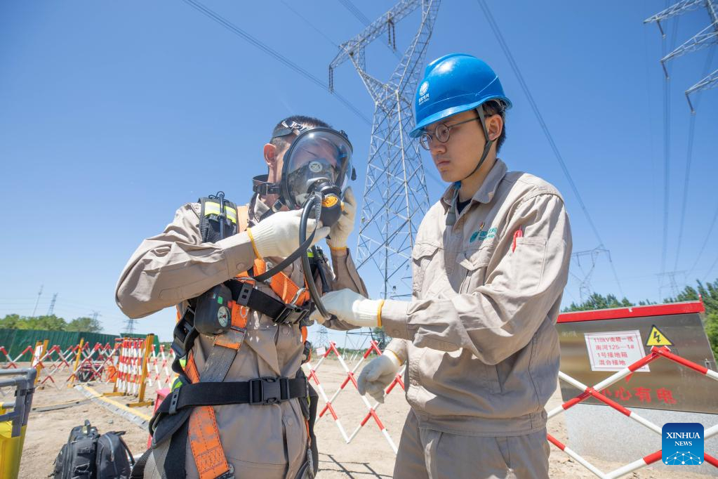 A staff member (L) of the State Grid Tianjin Electric Power Company wears a positive pressure respirator before he patrols underground tunnels in Tianjin, north China, June 16, 2023. (Xinhua)