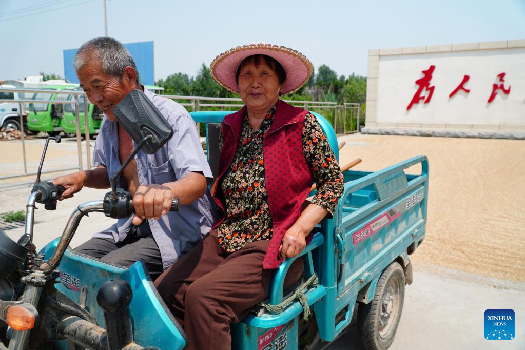 Farmers transport newly harvested grain to the government compound for drying, in Linnan Town in Linyi County, east China's Shandong Province, June 13, 2023. As the latest round of heatwaves coincides with the summer harvest season, many cities in Shandong have opened government compounds and village entertainment venues and squares for farmers to dry their grain. (Xinhua/Xu Suhui)