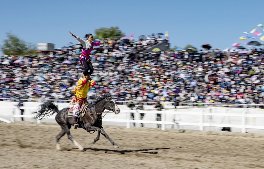 Riders perform on horseback to celebrate Lhasa Shoton (yogurt banquet) Festival in Lhasa, southwest China's Tibet Autonomous Region, Aug. 20, 2020. (Xinhua/Sun Fei)
