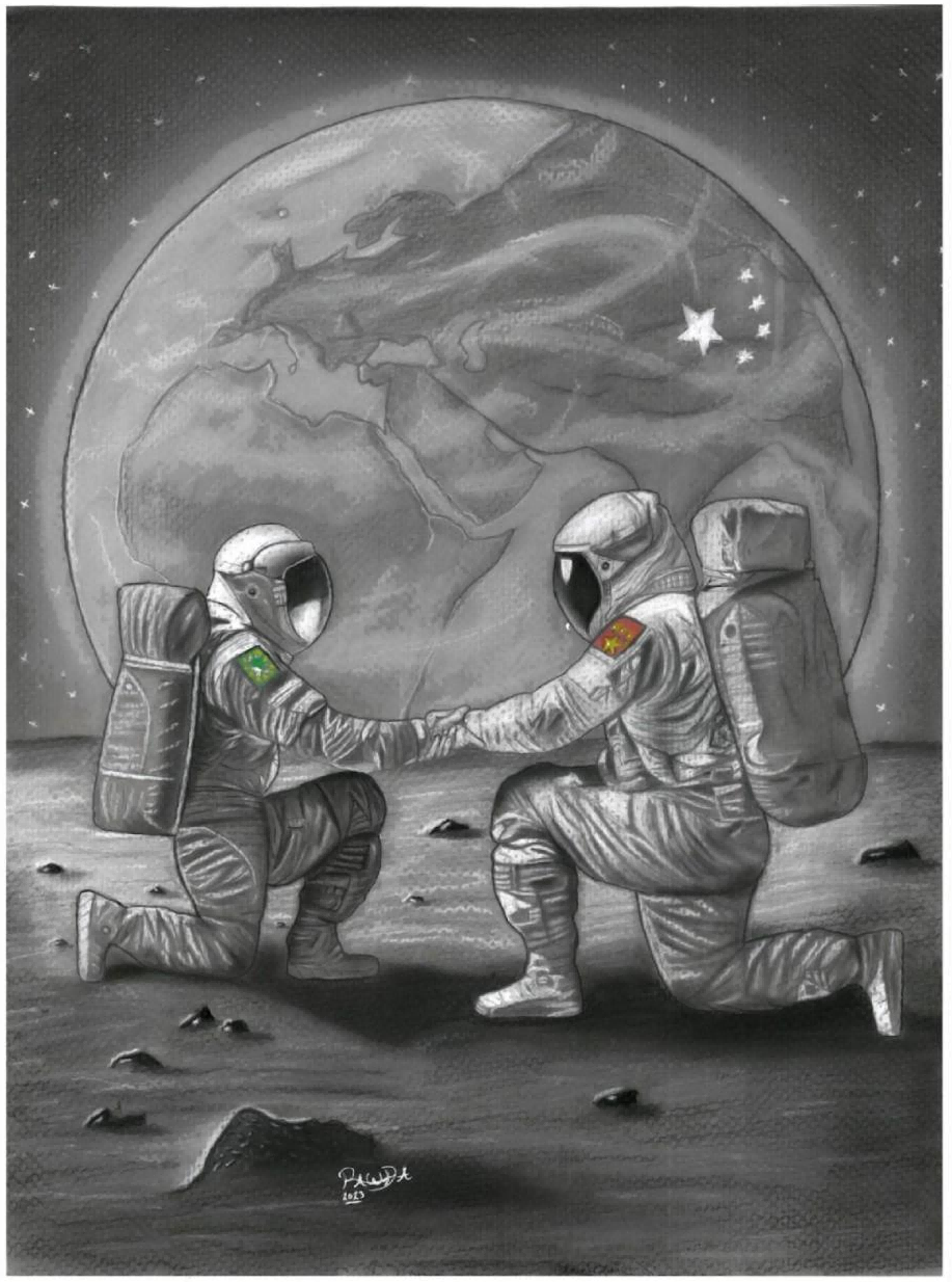 "The handshake between the Chinese and African taikonauts on the moon is a symbol of the close cooperation between China and Africa. The five conspicuous stars on Earth behind them represent China's leading position in aerospace," she explained.