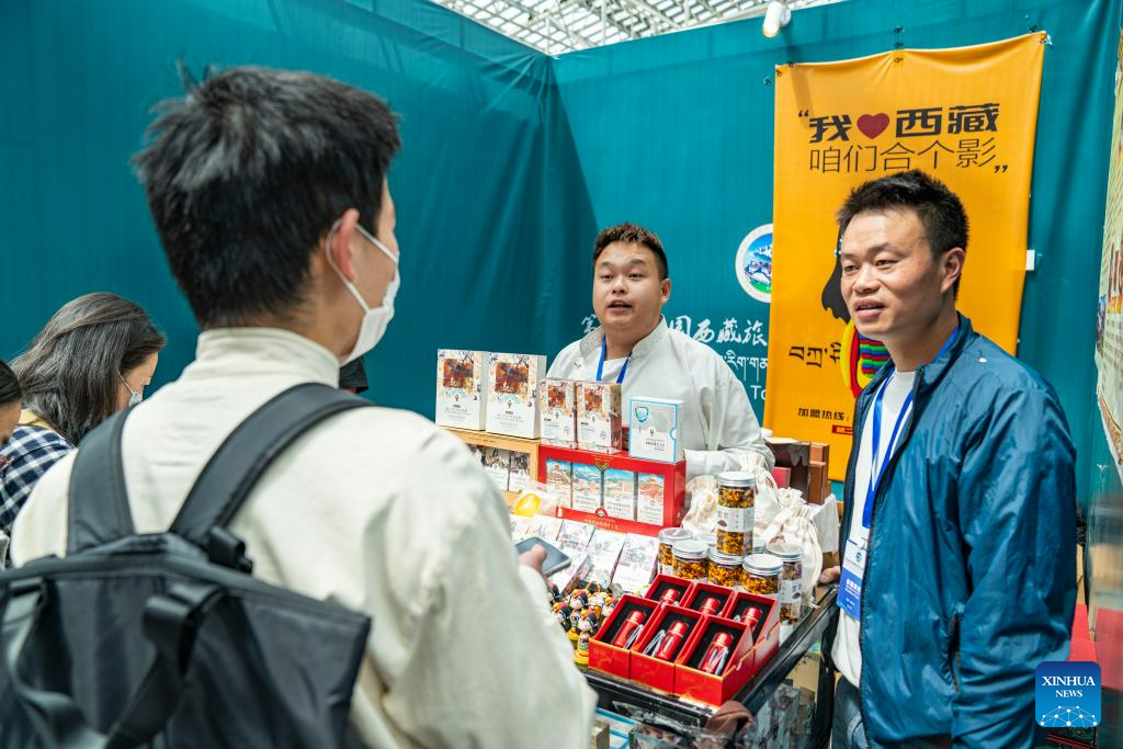 A trader selling products from Vietnam at the 5th China Xizang Tourism and Culture Expo in Lhasa, capital of southwest China's Tibet Autonomous Region, June 18, 2023. The expo is one of the most important events on Tibet's cultural calendar. (Xinhua/Jigme Dorje)