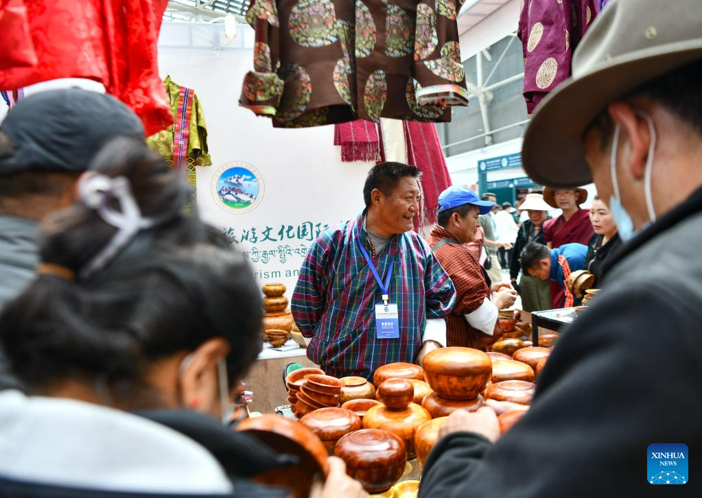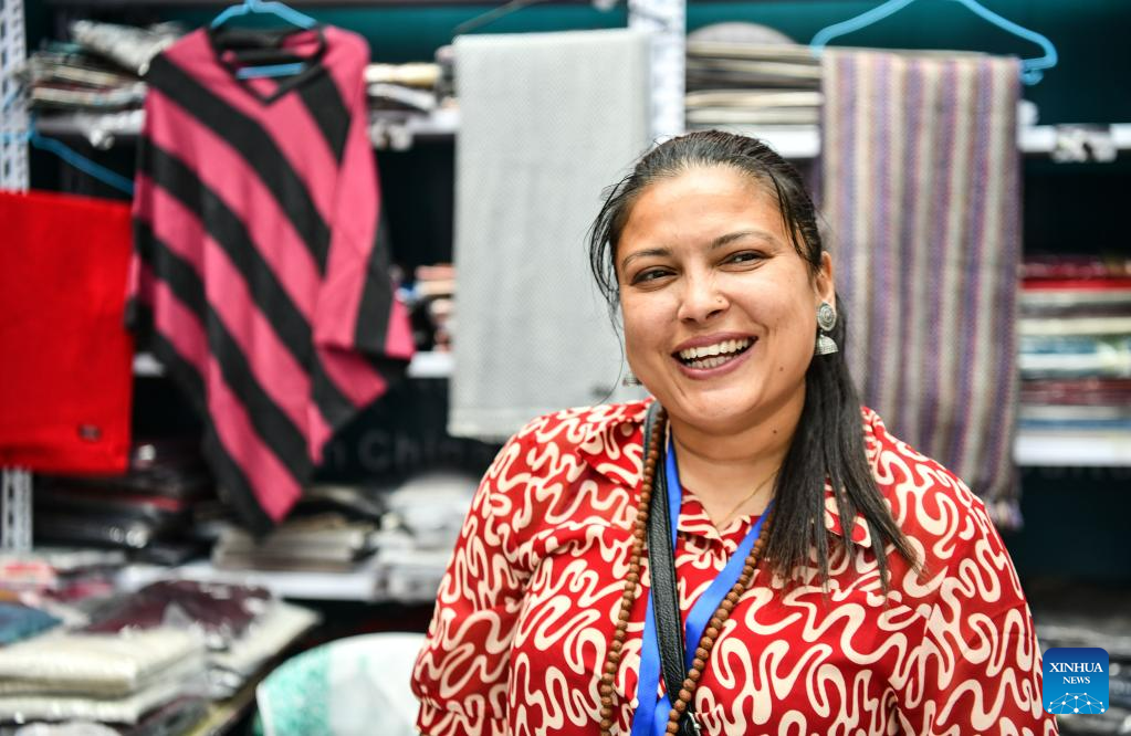 A Bhutanese trader sells products at the 5th China Xizang Tourism and Culture Expo in Lhasa, capital of southwest China's Tibet Autonomous Region, June 18, 2023. The expo is one of the most important events on Tibet's cultural calendar. (Xinhua/Jigme Dorje)