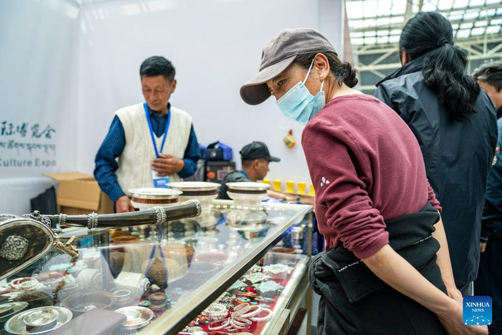 A visitor looks at Tibetan handicrafts at the 5th China Xizang Tourism and Culture Expo in Lhasa, capital of southwest China's Tibet Autonomous Region, June 18, 2023. The expo is one of the most important events on Tibet's cultural calendar. (Xinhua/Sun Fei)