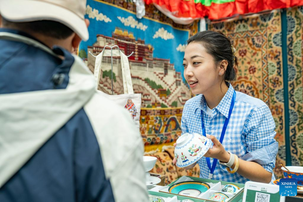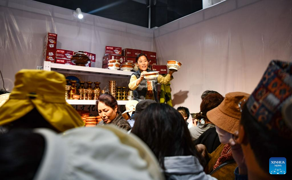 A trader sells Tibetan bowls at the 5th China Xizang Tourism and Culture Expo in Lhasa, capital of southwest China's Tibet Autonomous Region, June 18, 2023. The expo is one of the most important events on Tibet's cultural calendar. (Xinhua/Jigme Dorje)