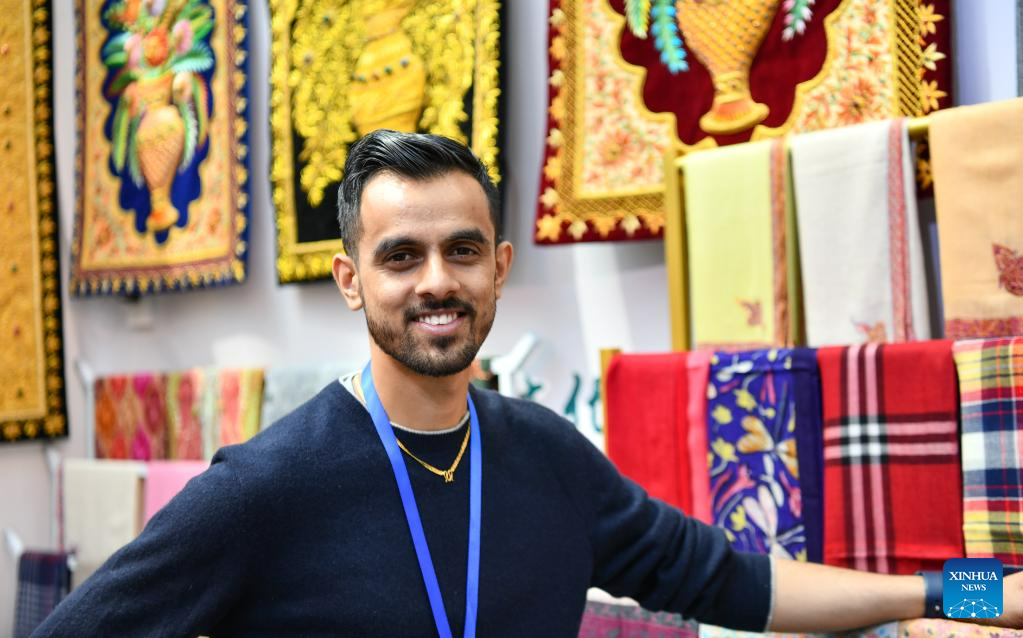 An Indian trader sells products at the 5th China Xizang Tourism and Culture Expo in Lhasa, capital of southwest China's Tibet Autonomous Region, June 18, 2023. The expo is one of the most important events on Tibet's cultural calendar. (Xinhua/Jigme Dorje)