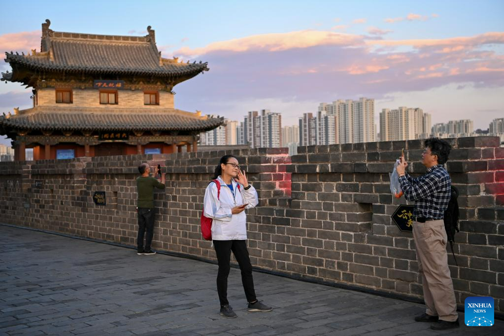 Visitors take photos on the ancient city wall in Datong, north China's Shanxi Province, June 8, 2023. Datong, with a history of over 2,000 years, is one of China's ancient capitals. In recent years, Datong has developed its tourism combining rich cultural heritages and well-known attractions. The historic city is shining with a new vitality. (Xinhua/Yang Chenguang)