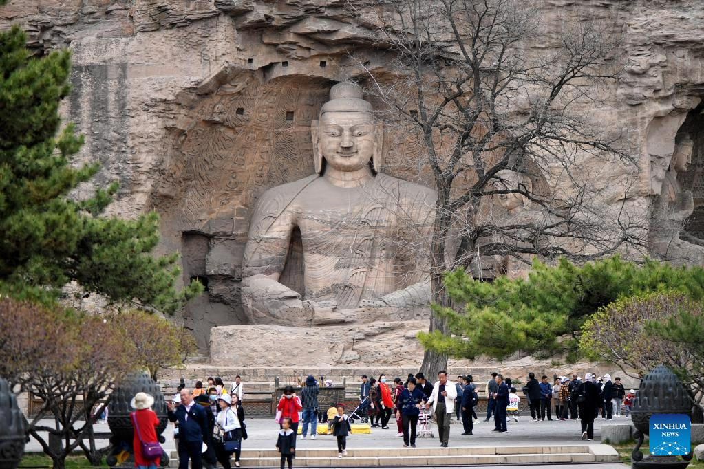 People visit the Yungang Grottoes in Datong, north China's Shanxi Province, May 9, 2021. Datong, with a history of over 2,000 years, is one of China's ancient capitals. In recent years, Datong has developed its tourism combining rich cultural heritages and well-known attractions. The historic city is shining with a new vitality. (Xinhua/Zhan Yan)