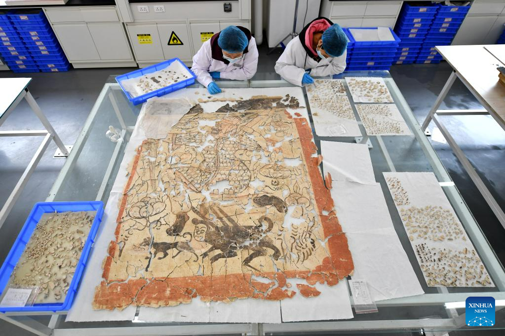 Technicians with the Yungang Grottoes Research Institute restore a piece of mural at their studio in Datong, north China's Shanxi Province, May 9, 2021. Datong, with a history of over 2,000 years, is one of China's ancient capitals. In recent years, Datong has developed its tourism combining rich cultural heritages and well-known attractions. The historic city is shining with a new vitality. (Xinhua/Zhan Yan)