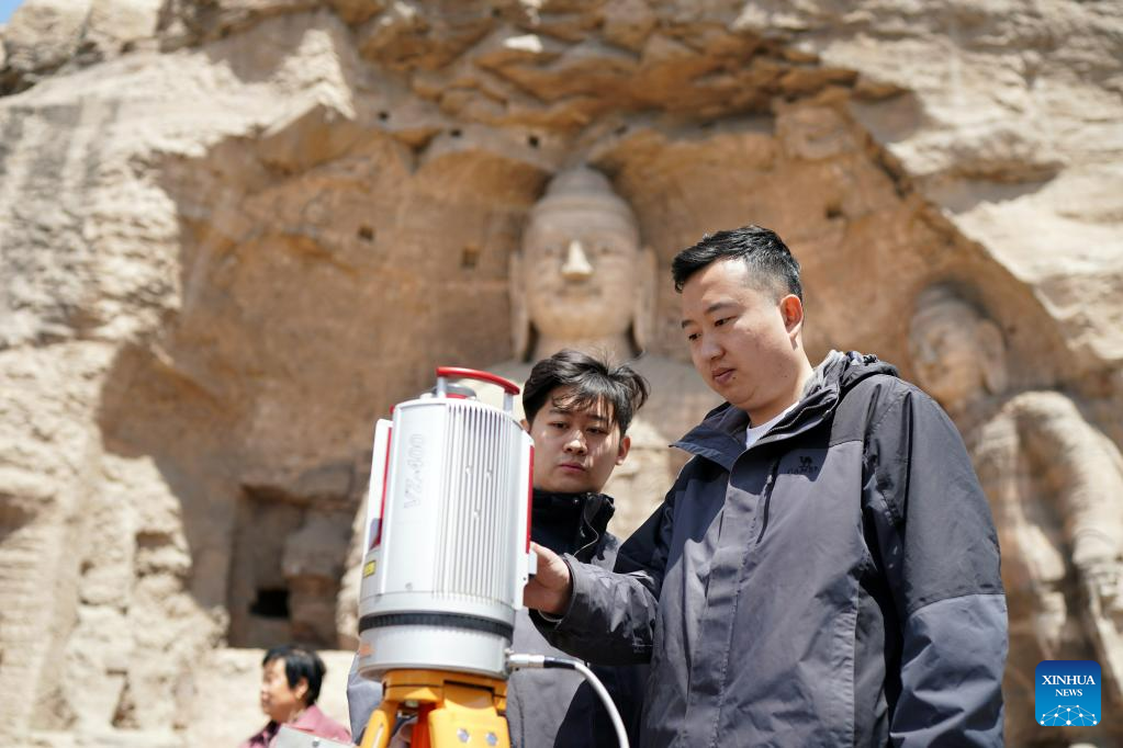 Technicians with the Yungang Grottoes Research Institute collect data at the Yungang Grottoes in Datong, north China's Shanxi Province, May 8, 2021. Datong, with a history of over 2,000 years, is one of China's ancient capitals. In recent years, Datong has developed its tourism combining rich cultural heritages and well-known attractions. The historic city is shining with a new vitality. (Xinhua/Zhan Yan)