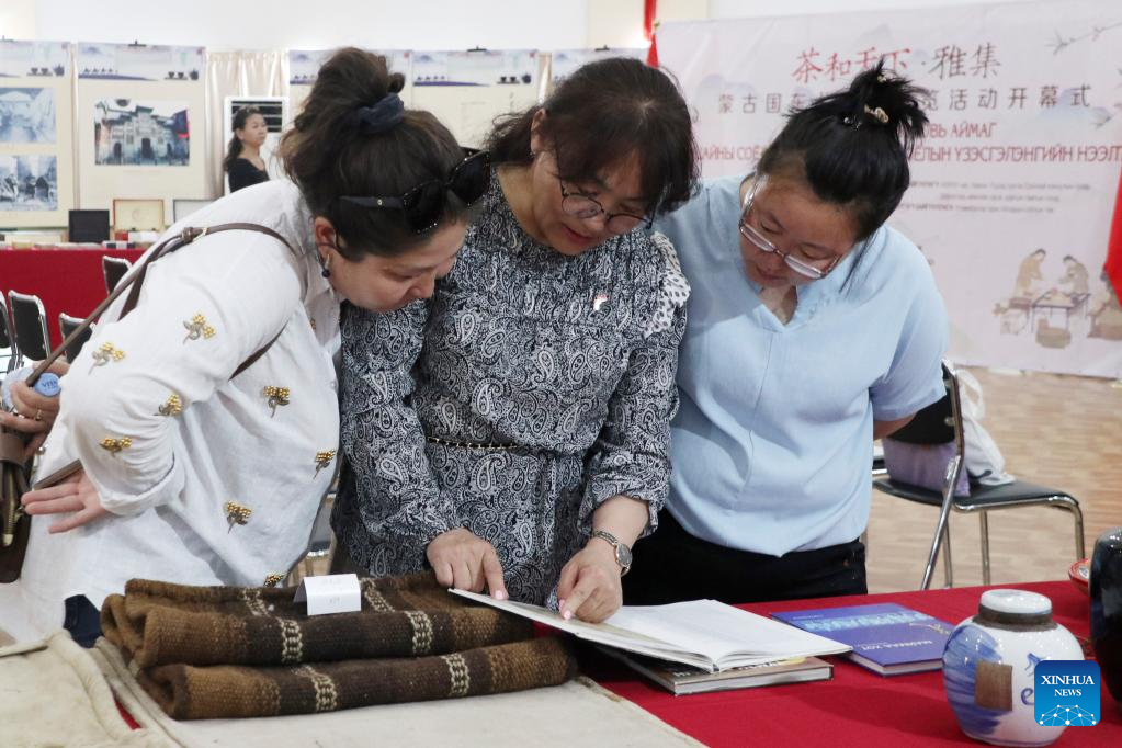 Visitors read a book at a Chinese tea culture exhibition in Sainshand, capital of the southeastern Mongolian province of Dornogovi, June 16, 2023. A Chinese tea culture exhibition opened on Friday here. Various types of tea and tea sets, as well as paintings and books on Chinese tea culture and the ancient Great Tea Road that connects Asia and Europe, are being showcased at the event. (Photo by Suriya/Xinhua)