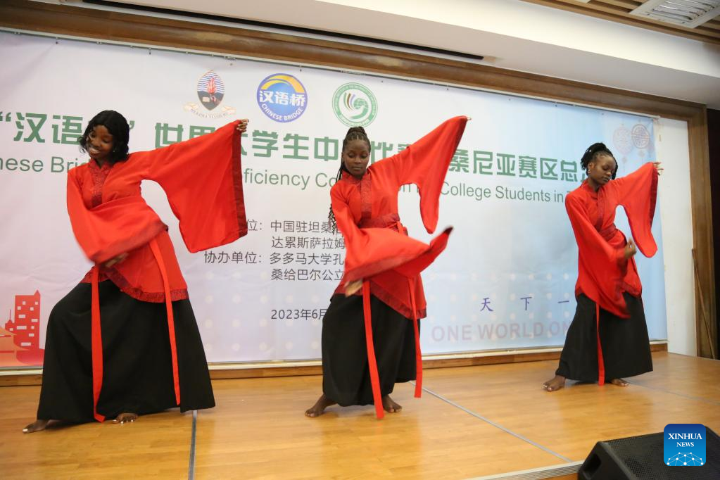 Tanzanian students perform their talents during the Chinese Language Competition in Dar es Salaam, Tanzania, on June 16, 2023. Twelve students from Tanzania's three higher learning institutions showed their skills in the Chinese language during the 22nd Chinese Bridge-Chinese Proficiency Competition held here Friday. (Photo by Herman Emmanuel/Xinhua)