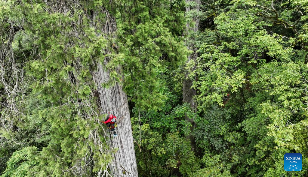 An expedition professional climbs the giant cypress measuring 102.3 meters at the national nature reserve of the Yarlung Zangbo Grand Canyon in Bome County, Nyingchi City, southwest China's Tibet Autonomous Region, June 15, 2023. The record of the tallest tree in the Chinese mainland has been refreshed several times in the past year or so. (Xinhua/Fei Maohua)