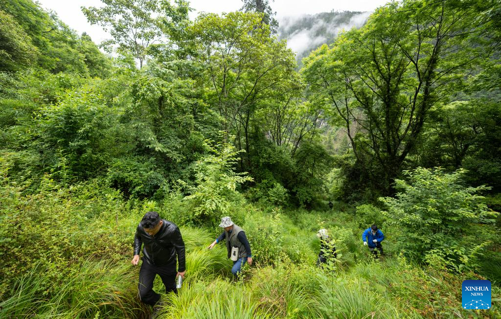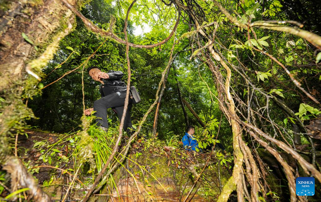 Staff members trek through forest to reach the giant cypress measuring 102.3 meters in Bome County, Nyingchi City, southwest China's Tibet Autonomous Region, June 15, 2023. The record of the tallest tree in the Chinese mainland has been refreshed several times in the past year or so. (Xinhua/Fei Maohua)