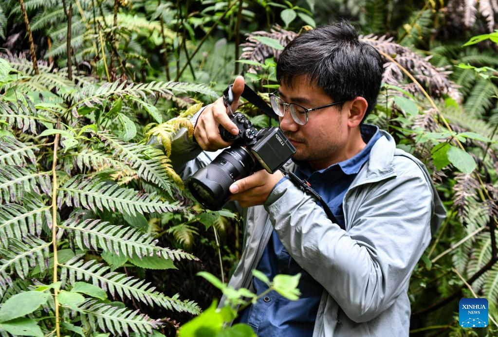 Wang Zi takes pictures of a Cupressus torulosa sapling at the national nature reserve of the Yarlung Zangbo Grand Canyon in Bome County, Nyingchi City, southwest China's Tibet Autonomous Region, June 15, 2023. The record of the tallest tree in the Chinese mainland has been refreshed several times in the past year or so. (Xinhua/Fei Maohua)